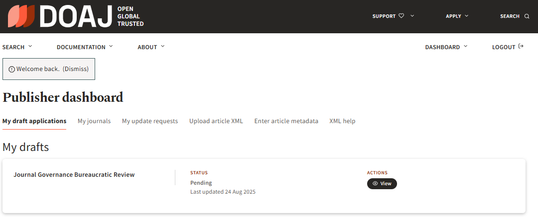 We are pleased to inform you that the application process for the Journal Governance Bureaucratic Review to be indexed in the Directory of Open Access Journals (DOAJ) has been successfully submitted and is currently under review with a pending status. The latest update regarding this application was recorded on August 24, 2025. We will continue to monitor the progress and provide you with any updates from the DOAJ team. Should there be any additional requirements or further documentation needed, we will promptly reach out to you. Thank you for your continued support and collaboration. We look forward to the successful indexing of our journal in DOAJ, which will significantly enhance its visibility and accessibility within the academic community.