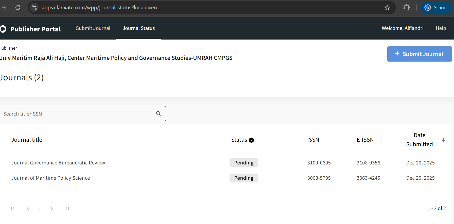 Journal Maritime Policy Science is currently undergoing the submission and evaluation process for indexing in Web of Science (WoS) through Clarivate. This effort reflects our commitment to strengthening editorial standards, journal quality, and international visibility.
