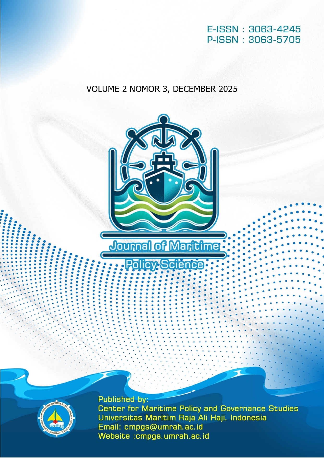 The first article, Revitalization of Marine Culture Through Maritime Based Development Policy in Indonesia, explores how Indonesia’s maritime development policies can serve as a vehicle for reviving traditional marine culture. The authors emphasize the importance of integrating cultural heritage, local wisdom, and modern governance frameworks to strengthen maritime identity and community participation in coastal development. The second article, Formation of Strategic Provinces on Maritime Borders: A Political Economy Analysis of Natuna-Anambas Proposal, examines the proposal to form a new strategic province in Indonesia’s maritime border region. Through a political economy lens, the paper analyzes the geopolitical, administrative, and economic considerations behind the Natuna–Anambas initiative, highlighting its potential to enhance national security and regional equity. The third article, Opportunities and Challenges for Local Governments in Increasing Local Revenues through Fisheries Trade System Reform Marine Capture in Bintan Regency, investigates the potential of fisheries trade reform as a local revenue strategy. The study discusses how market efficiency, governance reforms, and policy innovations can improve the performance of Bintan’s marine capture fisheries while supporting sustainable livelihoods. The fourth article, Public Management Model in Marine Pollution Control: A Case Study of Bintan Regency, evaluates the effectiveness of public management approaches in addressing marine pollution. The authors present a case study from Bintan Regency to assess institutional coordination, enforcement mechanisms, and community engagement in marine environmental governance. The final article, Maritime Security and Drug Threats in the Border Waters of Bintan Regency: The Perspective of the Bintan Resort Police, offers a law enforcement perspective on maritime security challenges. It highlights the growing threats of drug trafficking in border waters and examines the strategic responses and interagency coordination efforts led by the Bintan Resort Police.